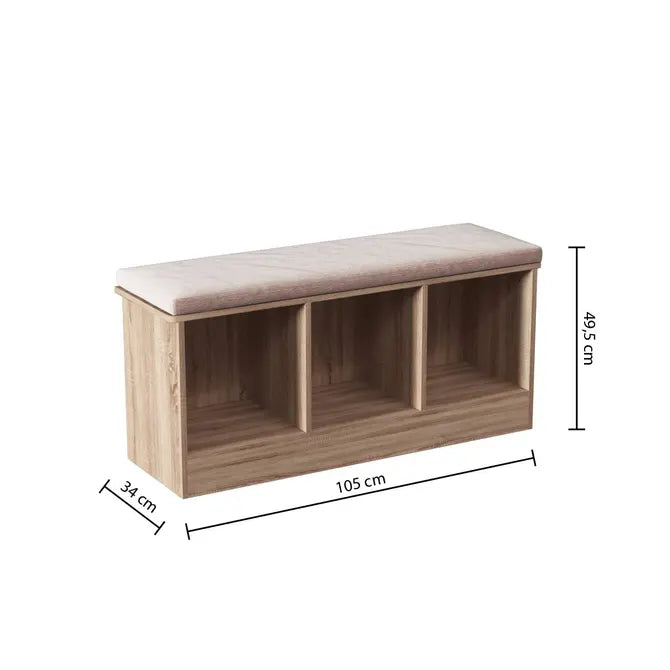 Трите отделения са идеални за обувки, чанти, аксесоари или домашен текстил, а компактният дизайн помага да оптимизирате пространството без компромис с визията. Пейката се вписва лесно в различни интериорни стилове и е отлично решение за поддържане на подреден дом.