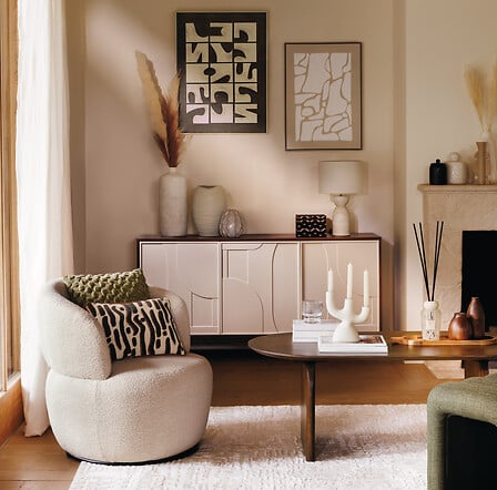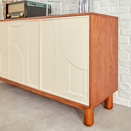 Elegantă comodă Jilani cu un design modern și fațade geometrice în relief. Este realizată din MDF cu furnir de frasin deschis și o structură interioară cu strat de melamină cu efect de nuc. Vopseaua acrilică mată accentuează textura naturală și adaugă rafinament interiorului.