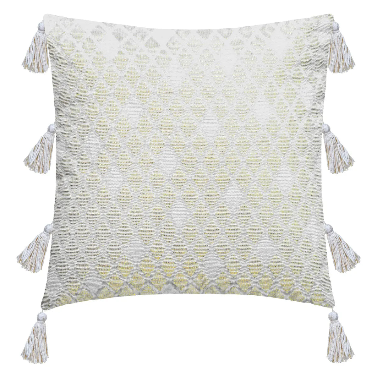 Husă de pernă confecționată dintr-o combinație de bumbac și poliester cu model jacquard. Accentul format din opt ciucuri decorativi în alb și auriu adaugă eleganță și farmec. Potrivită pentru o canapea, fotoliu sau dormitor.
