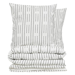 Комплектът включва плик за завивка с практично закопчаване с копчета и две квадратни калъфки за възглавници с размер 65x65 cm. Памукът с ленен ефект е лесен за поддръжка, като запазва своя естествен релеф и стилен вид без нужда от гладене. Материята е устойчива, приятна на допир и създава усещане за уют и топлина през цялата година.
