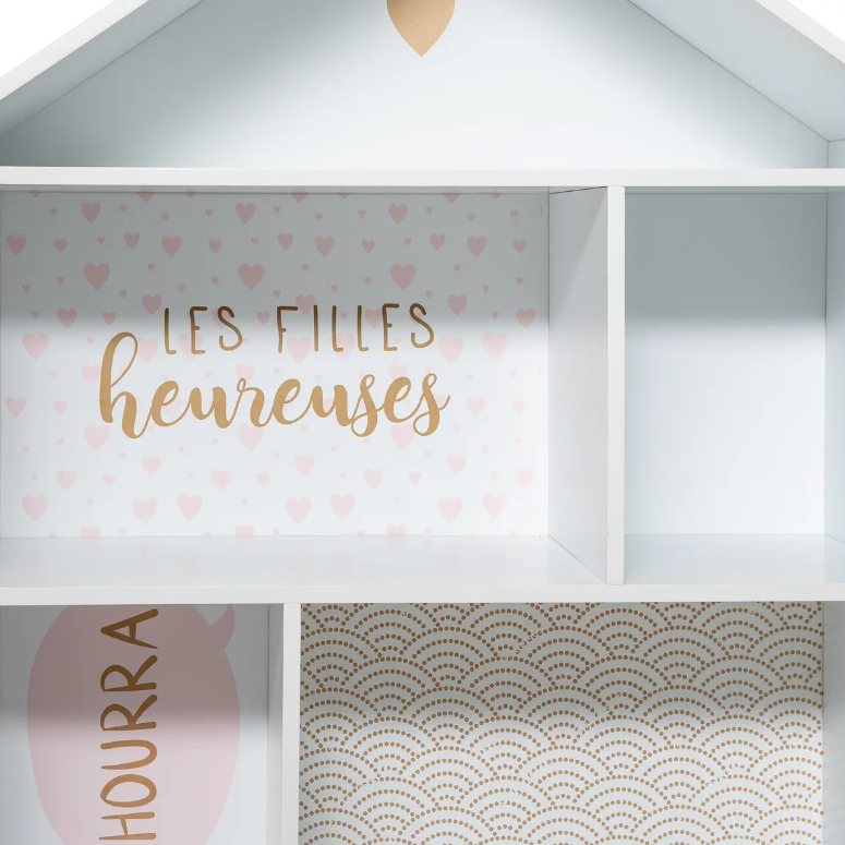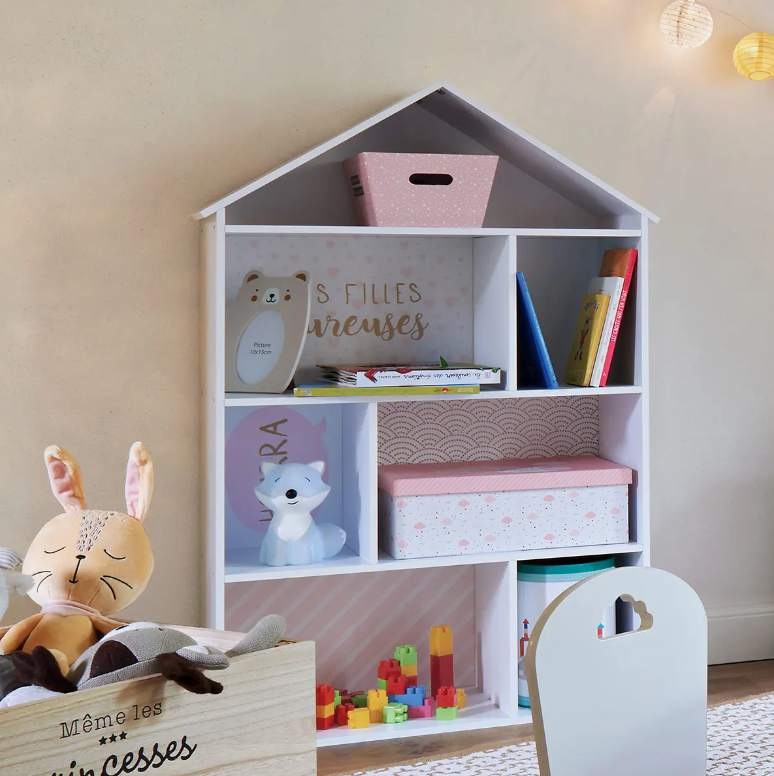 O bibliotecă în formă de casă care combină spațiul de depozitare funcțional cu un decor atractiv pentru camera copilului. Compartimentele multiple oferă spațiu convenabil pentru jucării, accesorii, jucării de pluș și cărți, ajutând copilul să mențină ordinea și să dezvolte organizarea.