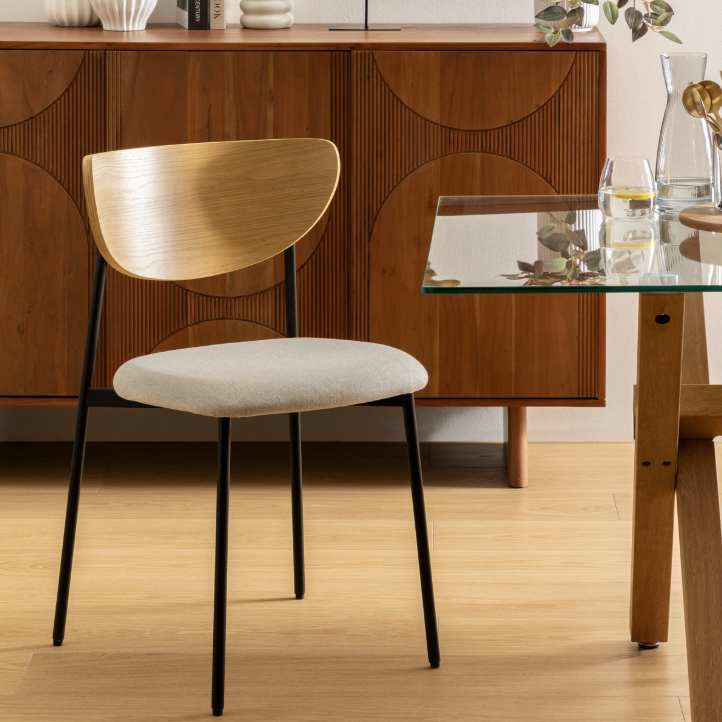Scaunul Jaisa impresionează printr-un design curat și elegant, combinând aspectul cald al spătarului din stejar cu șezutul tapițat confortabil, de culoare bej. Umplutura densă din spumă oferă confort, în timp ce baza din oțel negru adaugă contrast modern și stabilitate. O alegere practică atât pentru biroul de acasă, cât și pentru mediile profesionale, mai ales în combinație cu un birou din lemn masiv pentru o atmosferă de lucru elegantă și concentrată.