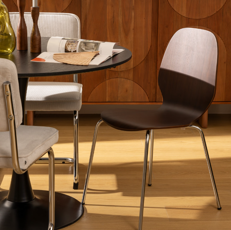 Scaunul Ouro este inspirat de designul clasic contemporan și impresionează prin aspectul său minimalist. Șezutul din furnir de stejar și fag aduce căldură și farmec natural, în timp ce structura din oțel negru accentuează contrastul modern dintre lemn și metal. Practic și confortabil, modelul este stivuibil, permițând depozitare ușoară și optimizarea spațiului.