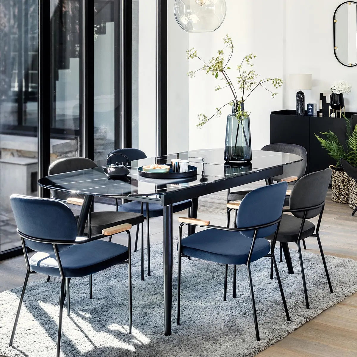 Cu stilul său contemporan elegant, masa de dining Mapu combină materiale clasice, precum sticla, cu o bază din oțel de designer cu un design sofisticat. Blatul oval din sticlă neagră cu efect de marmură este evidențiat de nervuri contrastante, conferindu-i un aspect mai delicat.
