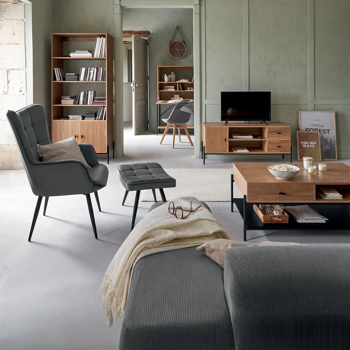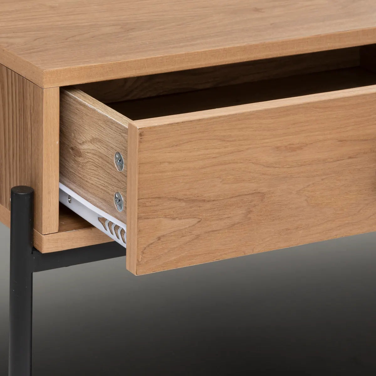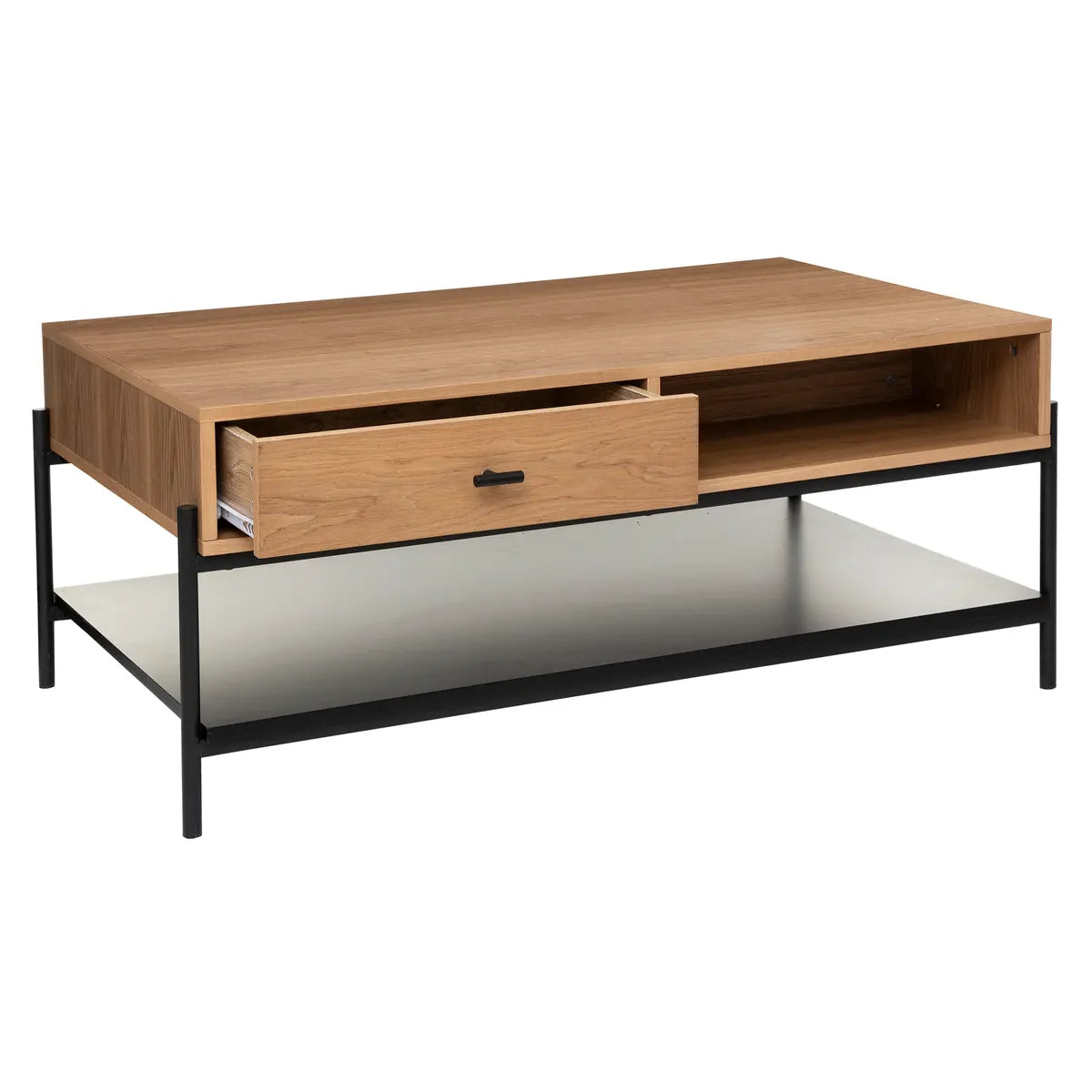 Masa de cafea Simon cu sertar are un aspect elegant, evidențiat de o ramă și picioare din metal negru. Picioarele mesei arată ca o extensie a ramei metalice, dar adaugă propria lor caracteristică designului general. Combinația de metal și lemn prezintă un contrast excepțional care îmbogățește aspectul și aduce profunzime suplimentară modelului.