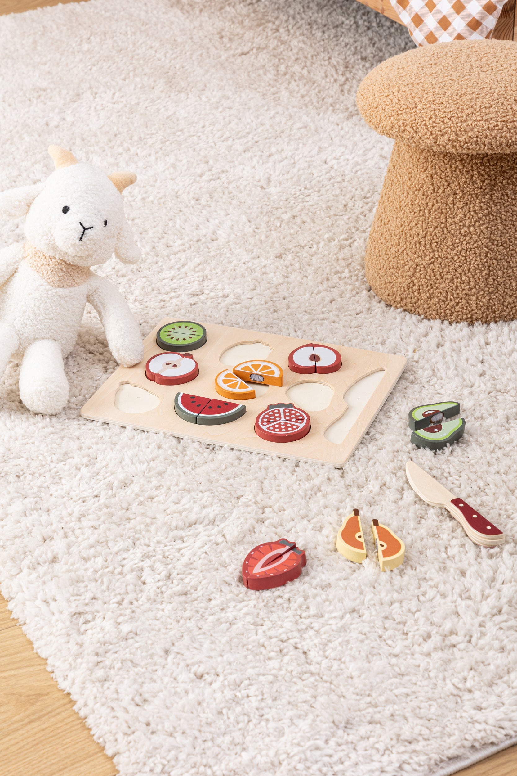 Include 9 fructe (1 kiwi, 1 căpșună, 1 piersică, 1 măr, 1 portocală, 1 avocado, 1 pară, 1 pepene verde și 1 rodie) care pot fi tăiate cu un cuțit de lemn. Tava cu fructe poate fi întoarsă pentru a fi folosită ca tocător. Jocul le permite copiilor să-și imite părinții, asigurând în același timp siguranța. De asemenea, îi ajută pe copii să recunoască diferite fructe. Piesele sunt conectate între ele cu ajutorul unui velcro. Este realizat cu vopsele non-toxice.