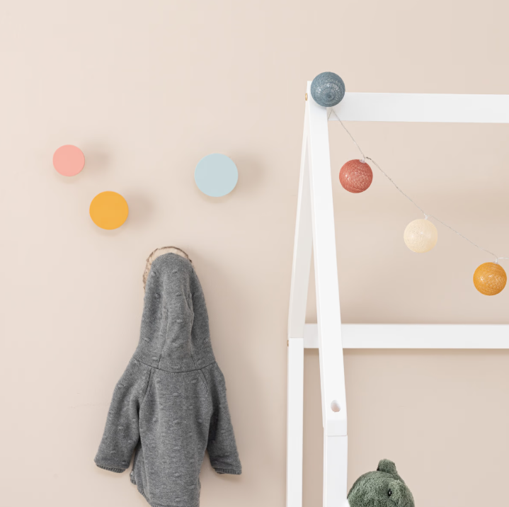 Set de umerașe în patru culori: verde, galben, roz și albastru. Diferitele dimensiuni pot fi atașate pe perete în aranjamentul dorit. Cu o capacitate maximă de 2 kg pe fiecare cârlig, acestea sunt ideale pentru agățarea diverselor accesorii, adăugând un accent colorat și jucăuș camerei. Fabricate din MDF, acestea combină stilul și caracterul practic.