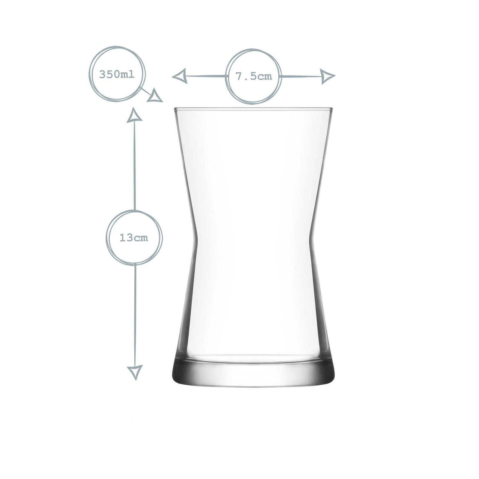 Set de 6 pahare LAV Derin din sticlă cu o capacitate de 350 ml. Cu un diametru de 8 cm și o înălțime de 13 cm, aceste pahare sunt ideale pentru servirea băuturilor răcoritoare, sucurilor și cocktailurilor. Cu un design elegant și un material durabil, sunt o alegere excelentă pentru utilizarea zilnică sau ocazii speciale.