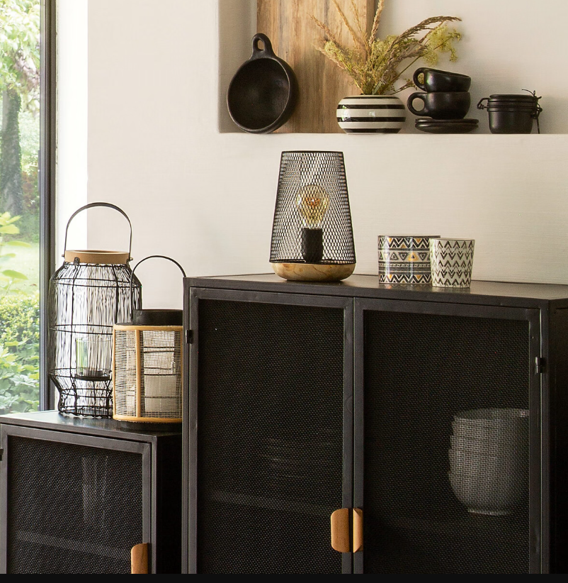 Lampa măsoară Ø 15 x H. 23 cm. Baza are 10 cm în diametru și 3 cm înălțime, iar cablul are 156 cm lungime. Este fabricată din oțel și lemn de pin, ceea ce îi conferă atât durabilitate, cât și farmec natural.