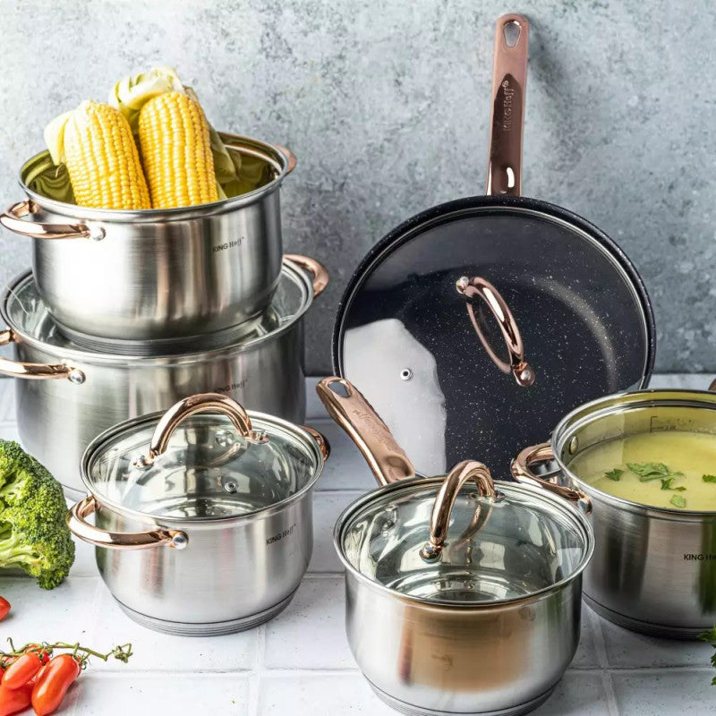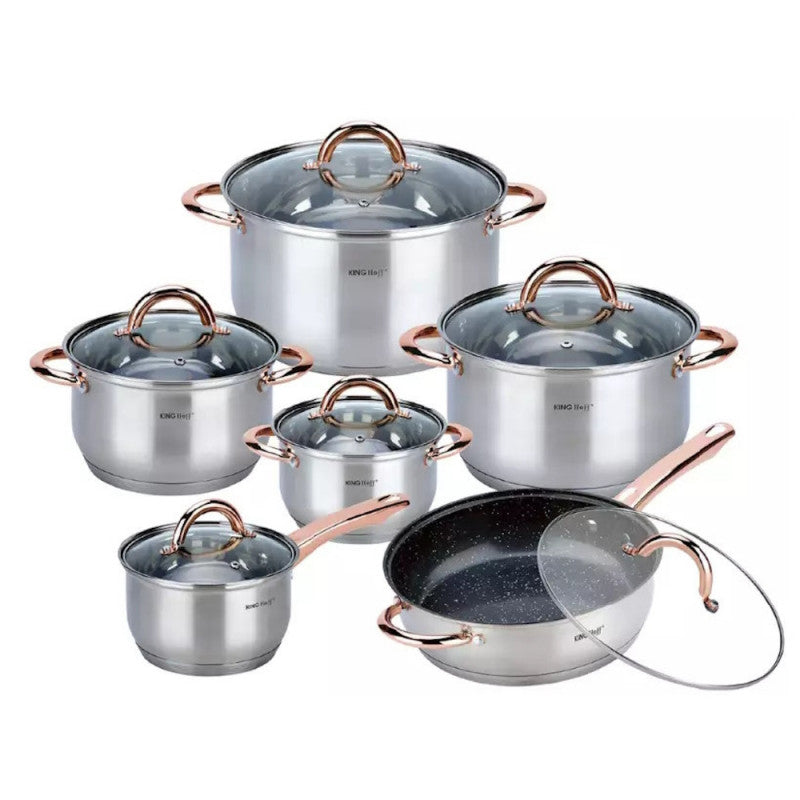 Set de oale și tigăi KingHoff 1766, 12 piese, tigăi placate cu marmură, inducție, oțel inoxidabil/auriu