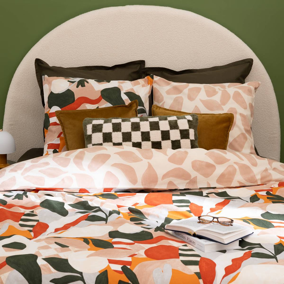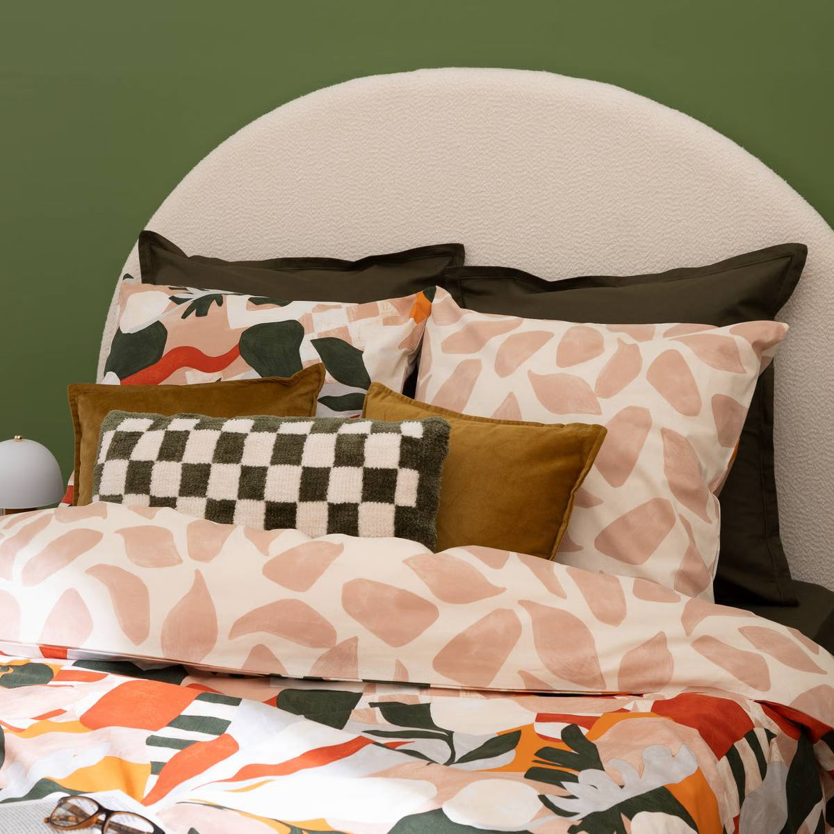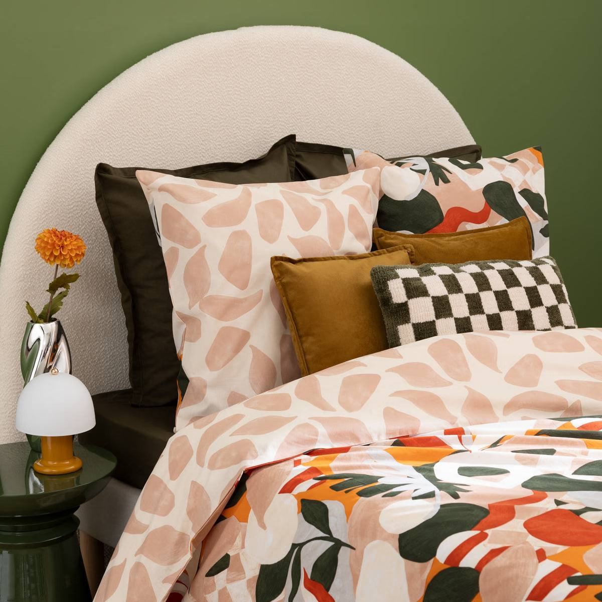 Комплектът е двулицев с напълно реверсивен дизайн – едната страна е красиво декорирана с деликатен принт, а другата е изчистена и едноцветна. Това ви позволява лесно да променяте стила на леглото според настроението си. Практичен и функционален, комплектът включва плик за завивка и две квадратни калъфки за възглавници, осигурявайки завършена и хармонична визия.