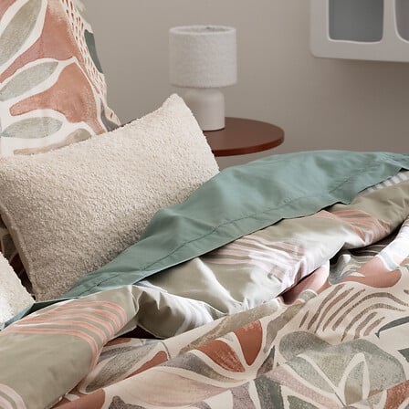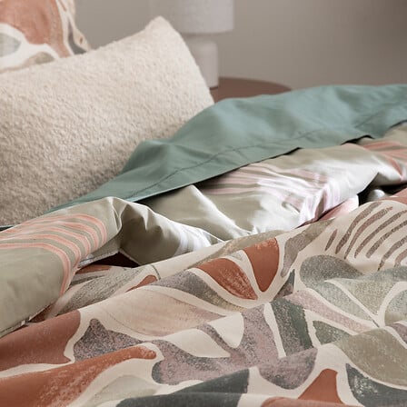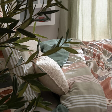 Комплектът е двулицев с напълно реверсивен дизайн – едната страна е красиво декорирана с деликатен принт, а другата е изчистена и едноцветна. Това ви позволява лесно да променяте стила на леглото според настроението си. Практичен и функционален, комплектът включва плик за завивка и две квадратни калъфки за възглавници, осигурявайки завършена и хармонична визия.