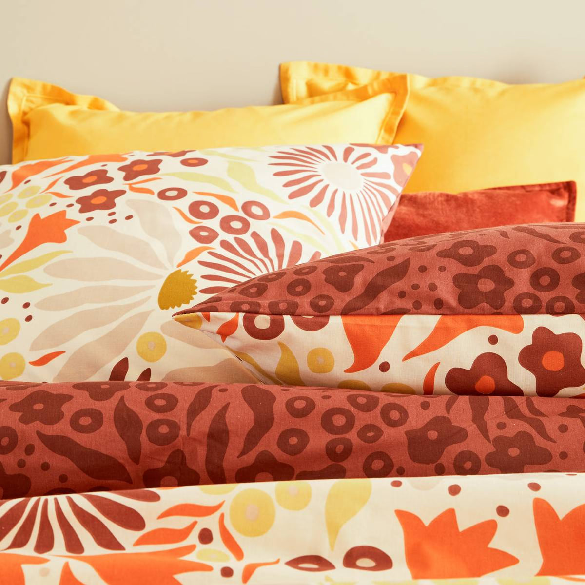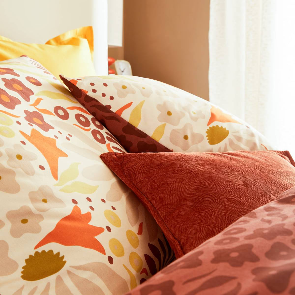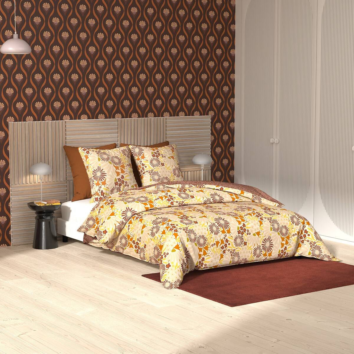 Комплектът е двулицев с напълно реверсивен дизайн – едната страна е красиво декорирана с деликатен принт, а другата е изчистена и едноцветна. Това ви позволява лесно да променяте стила на леглото според настроението си. Практичен и функционален, комплектът включва плик за завивка и две квадратни калъфки за възглавници, осигурявайки завършена и хармонична визия.