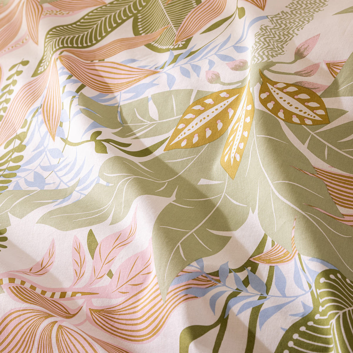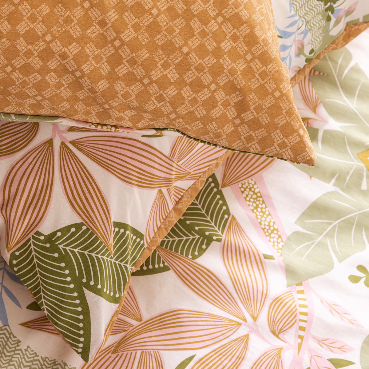 Комплектът е двулицев с напълно реверсивен дизайн – едната страна е деликатно декорирана с красив принт, докато другата е изчистена и едноцветна. Това ви позволява лесно да променяте стила на леглото според настроението си. Практичен и функционален, комплектът включва плик за завивка и две квадратни калъфки за възглавници, осигурявайки завършена и хармонична визия.