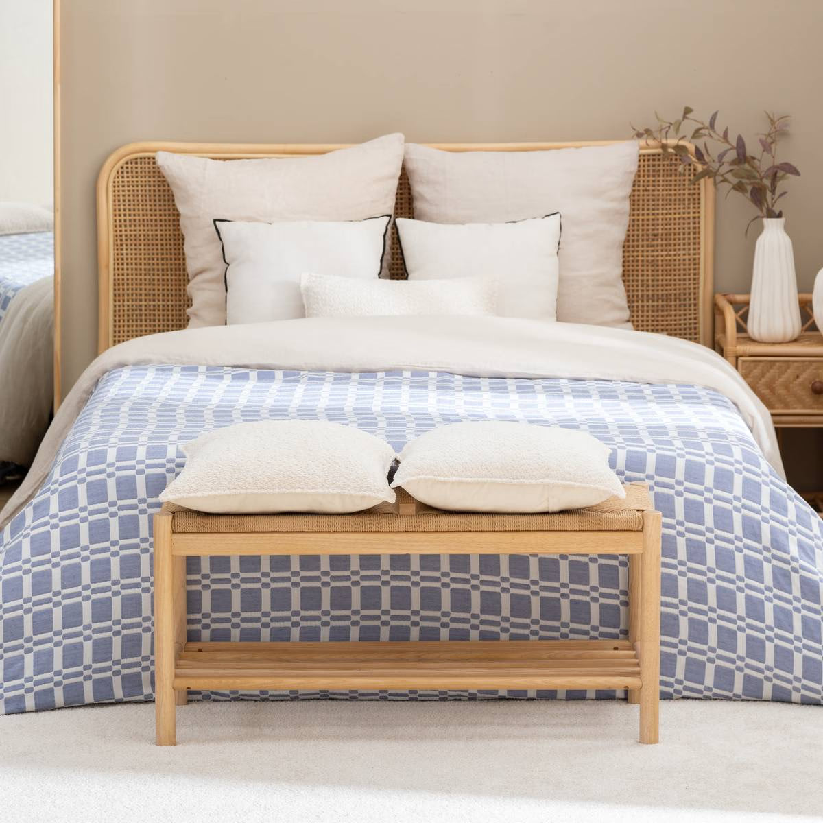 Покривалото впечатлява с нежни мотиви в меки, успокояващи тонове, идеални за атмосферата на спалнята. То е подходящо за голямо двойно легло и е двулицево, което позволява бърза промяна на визията според настроението или стила на декора.