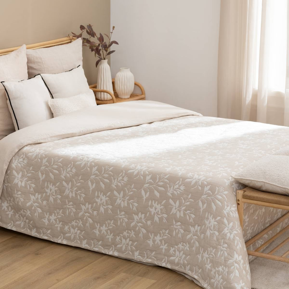 Покривалото впечатлява с нежни мотиви в меки, успокояващи тонове, идеални за атмосферата на спалнята. То е подходящо за голямо двойно легло и е двулицево, което позволява бърза промяна на визията според настроението или стила на декора.