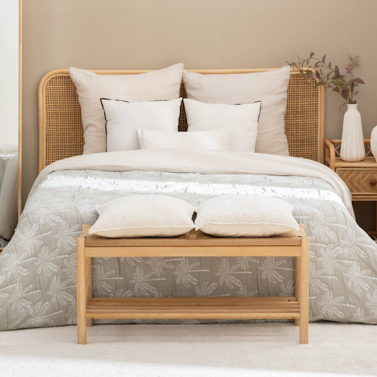 Покривалото впечатлява с нежни мотиви в меки тонове, които носят спокойствие и хармония в спалнята. Подходящо за голямо двойно легло, то осигурява красив завършек на интериора и създава уютна атмосфера. Моделът е двулицев, което позволява бърза промяна на визията според настроението и стила на помещението.