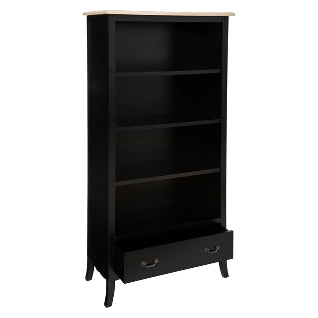 În partea de jos se află un sertar mare cu dimensiunile de 68,5x29,5x17,5 cm, potrivit pentru depozitarea diverselor accesorii și obiecte. Datorită dimensiunilor sale compacte și construcției înalte, biblioteca este o alegere ideală pentru un living, birou sau dormitor.