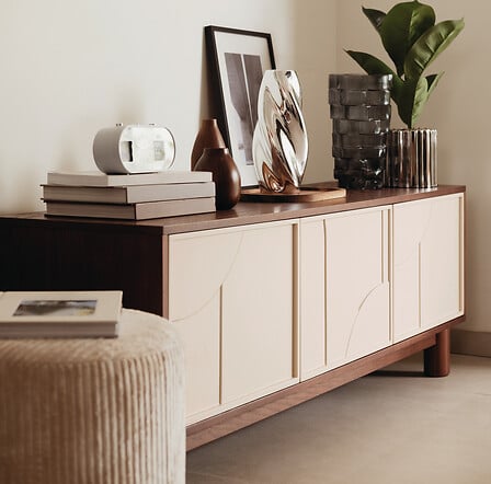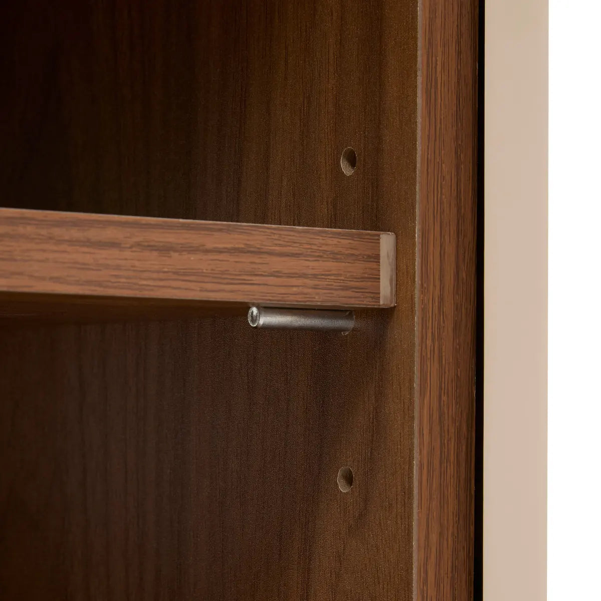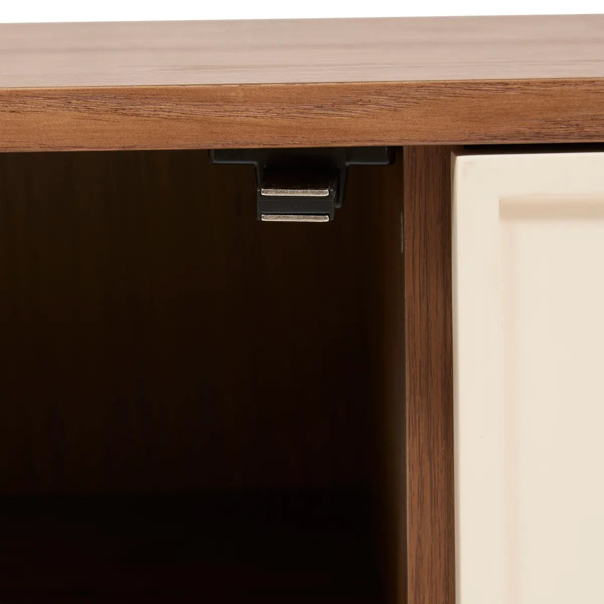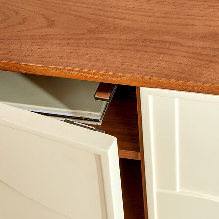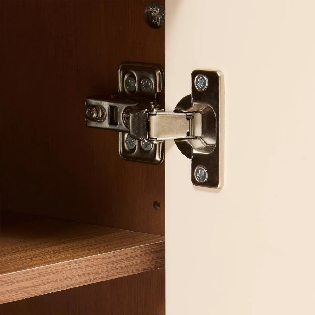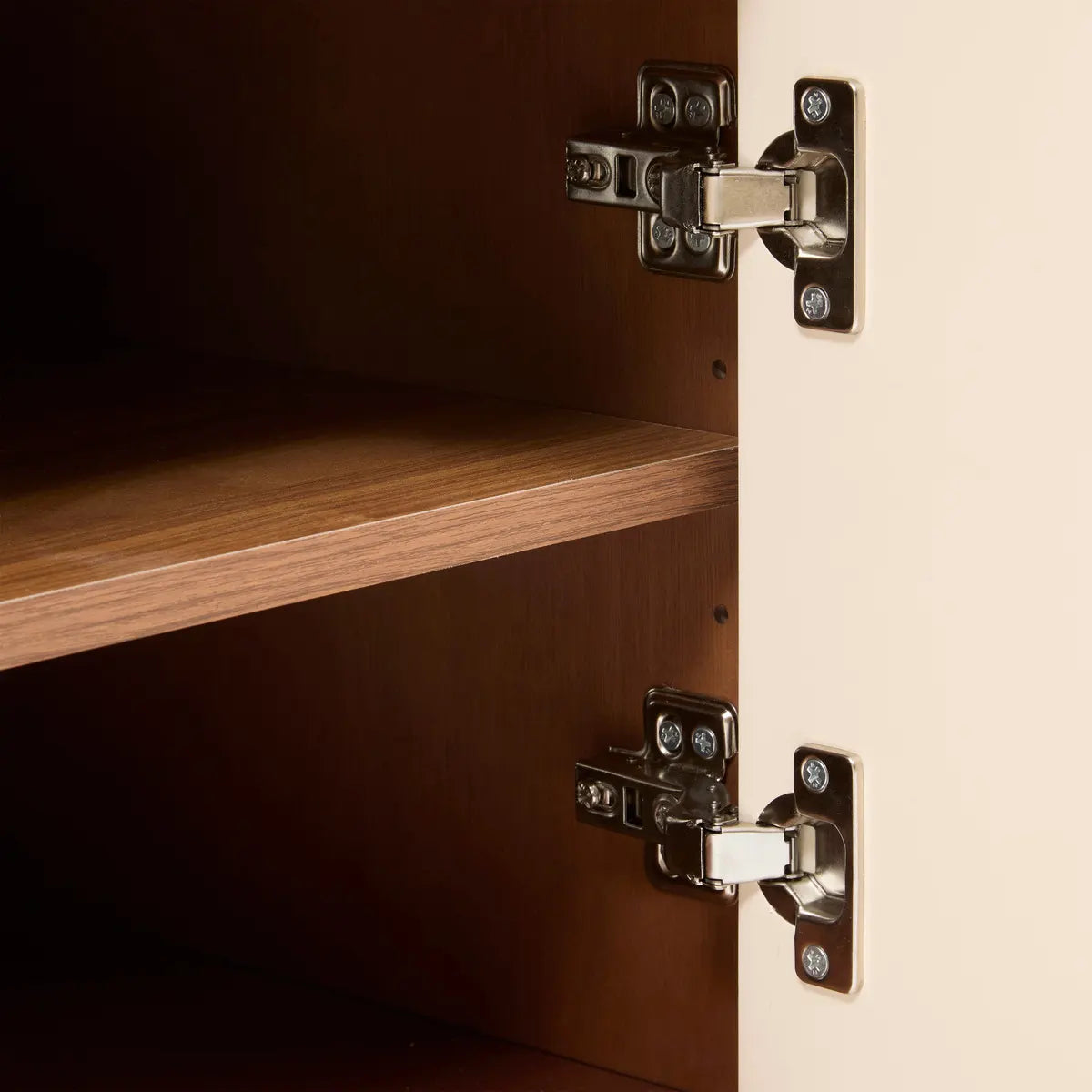 Dulapul oferă un spațiu excelent organizat - 4 compartimente cu uși și rafturi reglabile, 1 sertar și 2 orificii pentru cabluri pentru a păstra ordinea. Este echipat cu un sistem de deschidere prin apăsare, balamale cu închidere silențioasă și tampoane de siguranță pentru stabilitate și protecție a podelei.