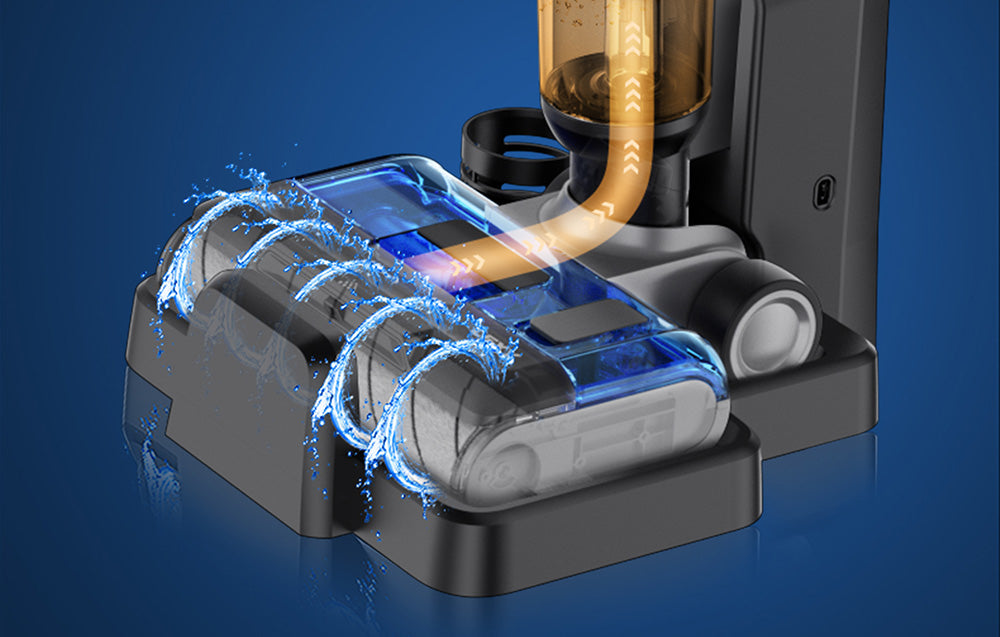 - Funcție de autocurățare : Prin apăsarea unui buton, rolele sunt spălate automat cu apă curată, împiedicând murdăria să se întoarcă pe podea.