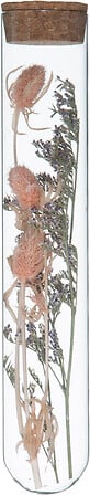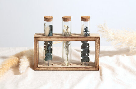 обавете винтидж акцент към интериора си с тази декоративна композиция от три стъклени тубуса със сухи цветя. Те са разположени върху правоъгълна основа от състарено дърво, която придава топлина и характер на пространството. Комбинацията от прозрачно стъкло и коркови тапи създава уютна визия, подходяща за рафт, конзолна маса или бюро.