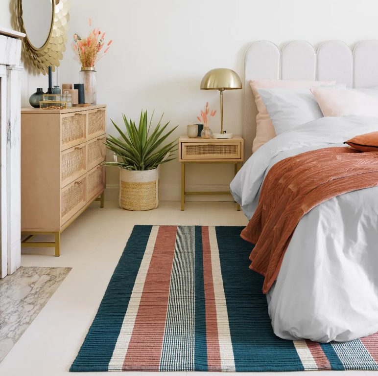 Covorul dreptunghiular din bumbac este ușor, confortabil și cu o textură naturală care aduce moliciune și confort oricărei camere. Dimensiunea sa universală este potrivită pentru dormitor, living sau sufragerie. Datorită designului său curat, se combină ușor cu diverse stiluri de interior - de la modern la clasic.