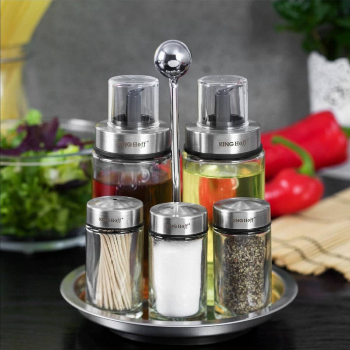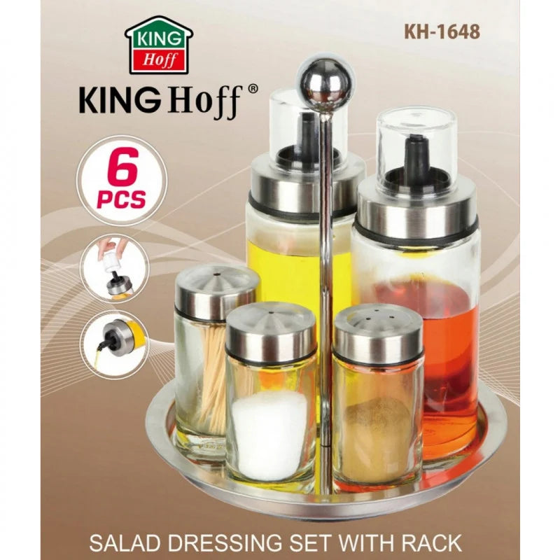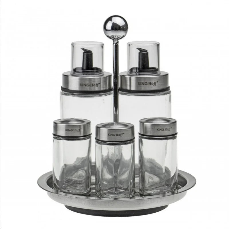 Set de 6 solnițe și ulei de măsline Kinghoff 1648, suport rotativ, sticlă/oțel inoxidabil