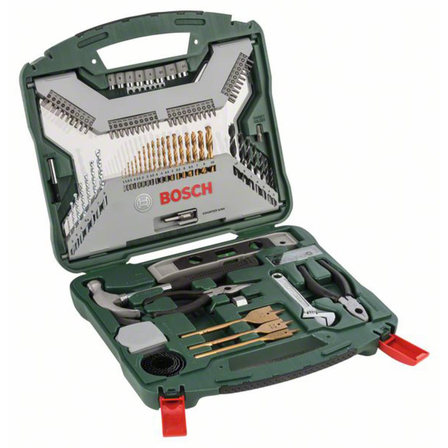**Cel mai bun echipament pentru aproape orice sarcină:** Set DIY de înaltă calitate într-o cutie practică, potrivit pentru toate tipurile de prelucrare a lemnului, pietrei și metalului. Setul include biți de șurubelniță și carote, precum și unelte utile, cum ar fi un ciocan, o ruletă, o nivelă, un clește cu vârf plat, un clește combinat și o cheie reglabilă. Burghiele pentru metal cu acoperire din nitrură de titan se caracterizează printr-o durată lungă de viață și o durabilitate ridicată. Acestea asigură o găurire rapidă și curată în diverse metale, plexiglas și materiale plastice dure (cu excepția aluminiului). Burghie pentru piatră de lungă durată cu vârf din carbură. Burghie standard pentru lemn și burghie de frezare plană cu acoperire din nitrură de titan pentru o viteză mai mare de tăiere și găuri curate și precise în lemn. Carote pentru găuri de ventilație în tavane, pereți sau mobilier. Potrivite pentru lemn dur și moale, panouri furniruite, PAL și gips-carton. Biți de șurubelniță pentru toate tipurile comune de capete de șuruburi. Cutie robustă din plastic cu conținut clar aranjat, care poate fi reumpletă după cum este necesar.
