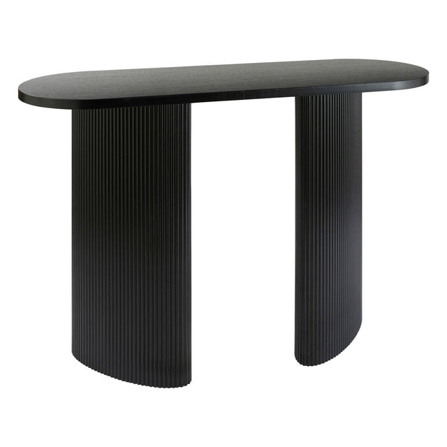 Masă consolă modernă cu blat oval și margini drepte, realizată din MDF cu finisaj melaminat cu efect de lemn negru. Datorită finisajului de înaltă calitate, suprafața este rezistentă la lichide și pete, fiind ușor de întreținut.