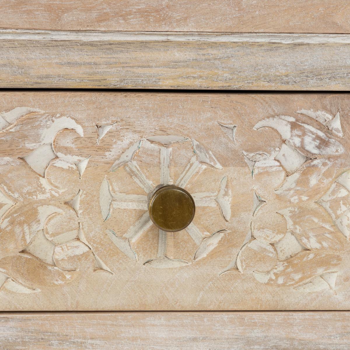 O masă consolă unică, realizată din lemn masiv de mango, cu ornamente lucrate manual pe sertare. Datorită măiestriei execuției și efectului de lemn decolorat, fiecare piesă este diferită și are un caracter unic.