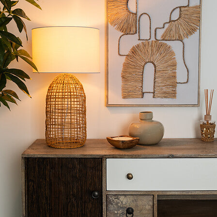Lampă de noapte din ratan cu un design elegant - o alegere stilată pentru o noptieră sau iluminat decorativ care aduce armonie și un accent natural casei tale.