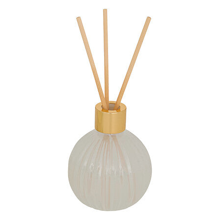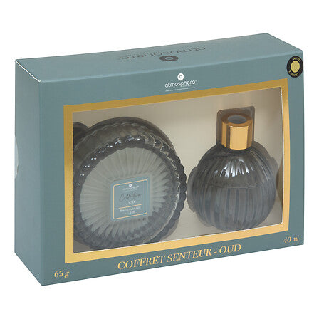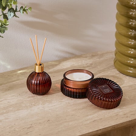 Комплектът включва внимателно подбрана ароматна свещ и дифузер, разположени в изящни цилиндрични съдове от рифлено стъкло. Дифузерът е оборудван с качествени ратанови пръчици, които осигуряват равномерно и дълготрайно разпръскване на благоуханието, докато свещта допълва атмосферата с мека светлина и нежно присъствие. Със своя модерен и минималистичен дизайн, елементите на комплекта се вписват перфектно в интериора на дневната, спалнята или офиса.