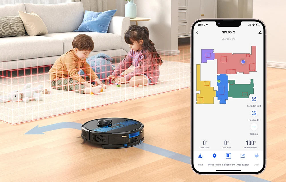 Sistemul de navigație LiDAR cu o rază de acțiune de până la 8 metri oferă scanare precisă a camerei, generare rapidă a hărților și planificare a rutelor optime de curățare. Robotul este, de asemenea, echipat cu senzori încorporați care previn coliziunile cu mobilierul și căderile pe scări, iar capacitatea bateriei de 2600 mAh oferă până la 120 de minute de funcționare cu o singură încărcare.
