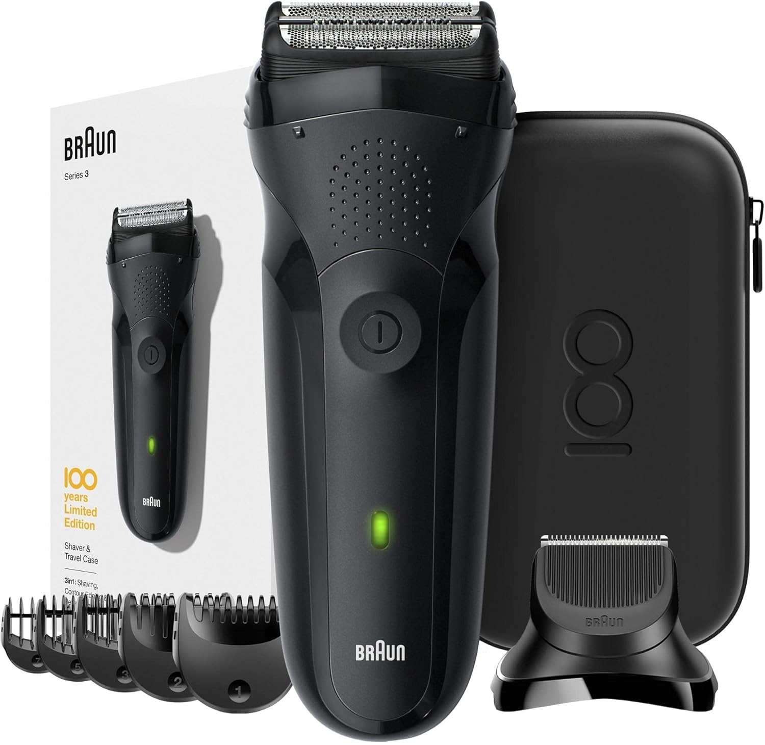 Aparat de ras Braun Series 3 MBS3 Max Braun 100 years Design Edition, Wet&Dry, 3 lame flexibile, + cap de tuns, 5 piepteni, set de călătorie Design Edition, negru