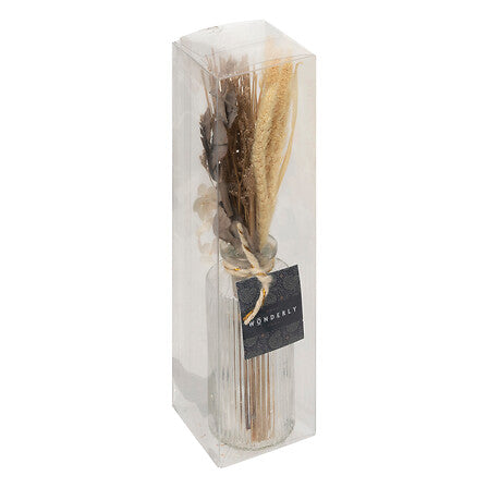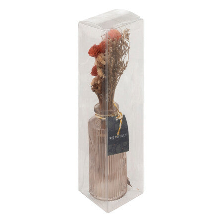 Внесете чар и стил във вашия дом с този сух букет "Wonder". Лесен за поддръжка, той съчетава разнообразие от текстури и цветове и се предлага в рифлен стъклен съд, който добавя леко рустикално излъчване. Перфектен за декорация на рафт, масичка или като подарък.