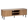Dulapul are două uși glisante cu efect „canelat” care ascund nișe separate pentru aranjarea echipamentelor, accesoriilor sau elementelor decorative. Orificiile încorporate pentru cabluri asigură confort și ordine. Cele două secțiuni de rafturi și nișele laterale oferă un spațiu amplu de depozitare, iar opțiunea de a alege mânere din lemn sau negre adaugă flexibilitate stilului.