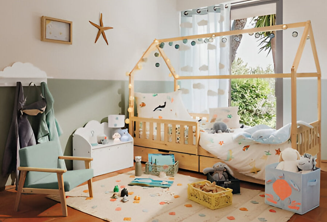 Детско легло с място за съхранение Монтесори Bosco с размери 194,8 × 98 × 155,5 см. Размери за матрак 90 × 190 см, изработено от бор и MDF. Леглото разполага с две чекмеджета за практично съхранение на дрехи, играчки или спално бельо и включена подматрачна рамка. Със своите размери и стабилна конструкция, то предлага множество възможности за декорация и е подходящо за широка възрастова група, съчетавайки комфорт и функционалност в детската стая. Тегло: 35,1 кг.
