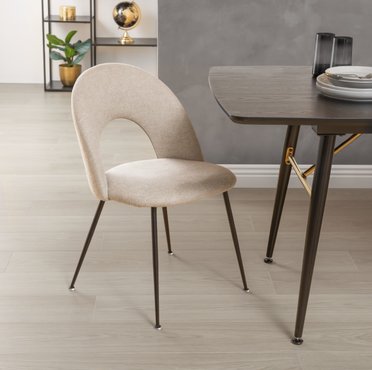 Scaunul Raven impresionează printr-un design elegant și curat, care se integrează ușor în interioarele moderne. Este tapițat cu material textil de înaltă calitate, de culoare bej, care contrastează frumos cu picioarele metalice negre. Spuma moale din șezut și spătar oferă confort, iar construcția durabilă garantează stabilitate. O alegere perfectă pentru o sufragerie, mai ales în combinație cu o masă din lemn închis la culoare și un covor elegant, pentru o atmosferă și mai confortabilă.