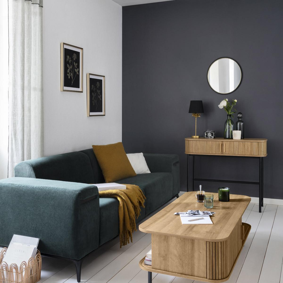 Masă consolă elegantă Atmosphera Colva, cu linii curate și un design modern. Blatul este dreptunghiular cu margini rotunjite și este realizat din MDF cu un strat de PVC cu efect de stejar, care garantează o rezistență mai bună la impact, umezeală și pete.