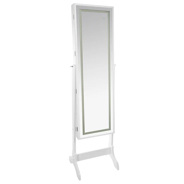 Dulapurile pentru bijuterii Bettany cu oglindă LED albă combină un aspect modern și o organizare practică. Cu o înălțime de 156 cm, oferă spațiu de depozitare convenabil pentru toate bijuteriile tale, având 40 de sloturi pentru inele și 40 de sloturi pentru cercei. Cârligele și suporturile mici îți permit să organizezi colierele și pandantivele fără riscul de încurcare. Oglinda independentă este convenabilă pentru o imagine completă a hainelor tale, iar ghirlanda LED de-a lungul marginii adaugă un accent contemporan. Dimensiunile sunt 47,5 × 37 × 148,5 cm, oglinda are 116 × 33 × 0,3 cm, iar greutatea este de 11,8 kg. Aceasta este o soluție elegantă și funcțională pentru o casă ordonată.