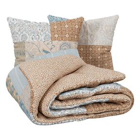 Комплектът е двулицев с напълно реверсивен дизайн – едната страна е красиво декорирана с деликатен принт, а другата е изчистена и едноцветна. Това ви позволява лесно да променяте стила на леглото според настроението си. Практичен и функционален, комплектът включва плик за завивка и две квадратни калъфки за възглавници, осигурявайки завършена и хармонична визия.