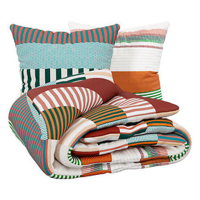 Комплектът е двулицев с напълно реверсивен дизайн – едната страна е красиво декорирана с деликатен принт, а другата е изчистена и едноцветна. Това ви позволява лесно да променяте стила на леглото според настроението си. Практичен и функционален, комплектът включва плик за завивка и две квадратни калъфки за възглавници, осигурявайки завършена и хармонична визия.