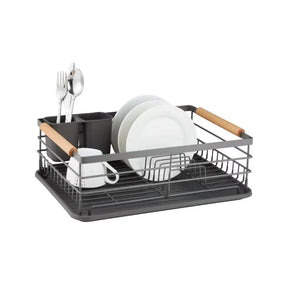 Suportul multifuncțional pentru farfurii asigură o aranjare stabilă, iar tava detașabilă facilitează întreținerea și curățarea. Modelul are suporturi practice pentru tacâmuri și inserții detașabile care permit sortarea și uscarea ușoară a lingurilor, furculițelor și cuțitelor. Mânerele din lemn de pe ambele părți oferă o purtare confortabilă și un accent tactil plăcut.