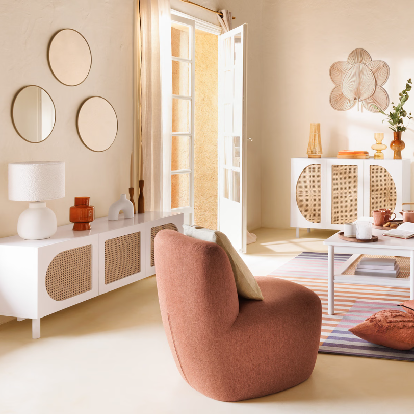Dispune de un spațiu intern practic de depozitare, potrivit pentru echipamente, accesorii sau obiecte decorative. Detaliile din ratan îi conferă un aspect luminos și aerisit, menținând în același timp o senzație de confort și stil natural.